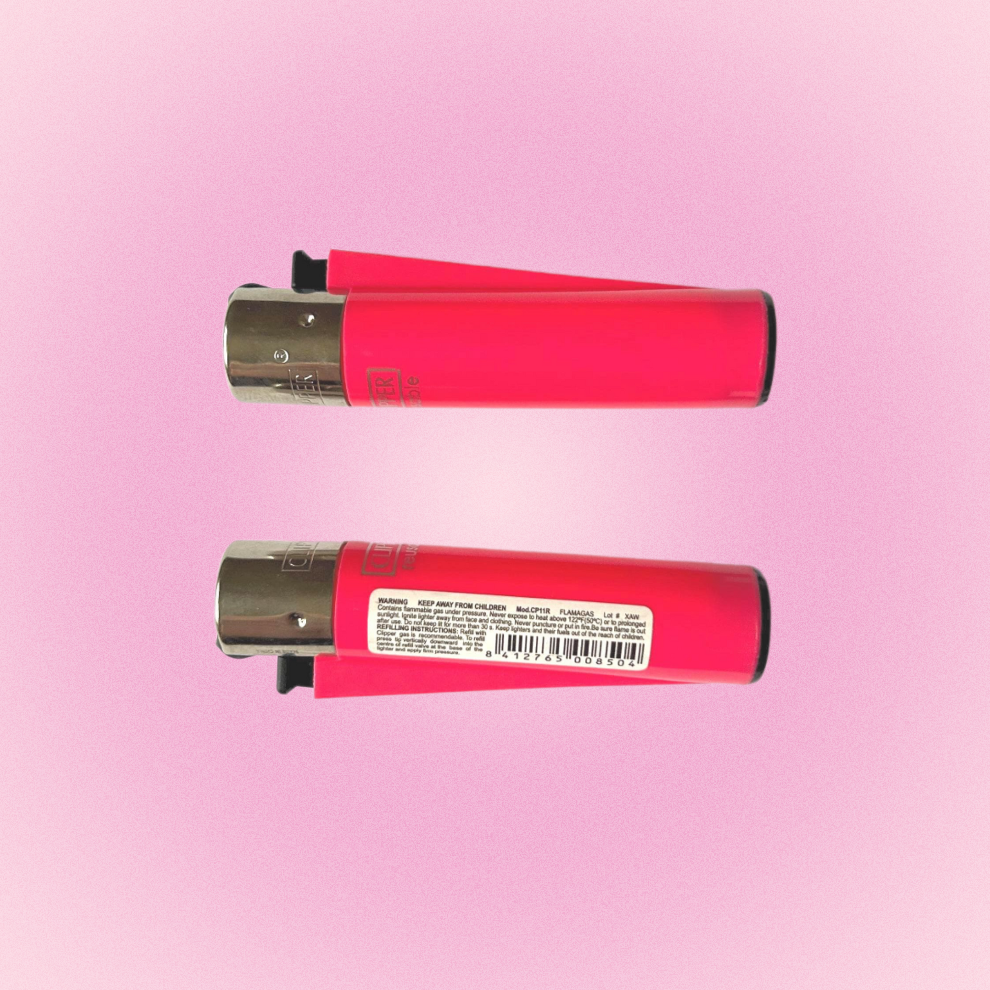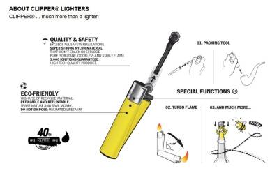 Clipper lighters are refillable and feature a replaceable flint that doubles as a herb pressing tool. They use cleaner isobutane gas and are predominantly made from recycled materials. The outer shell is made of durable nylon, reducing the risk of breaks or explosions.